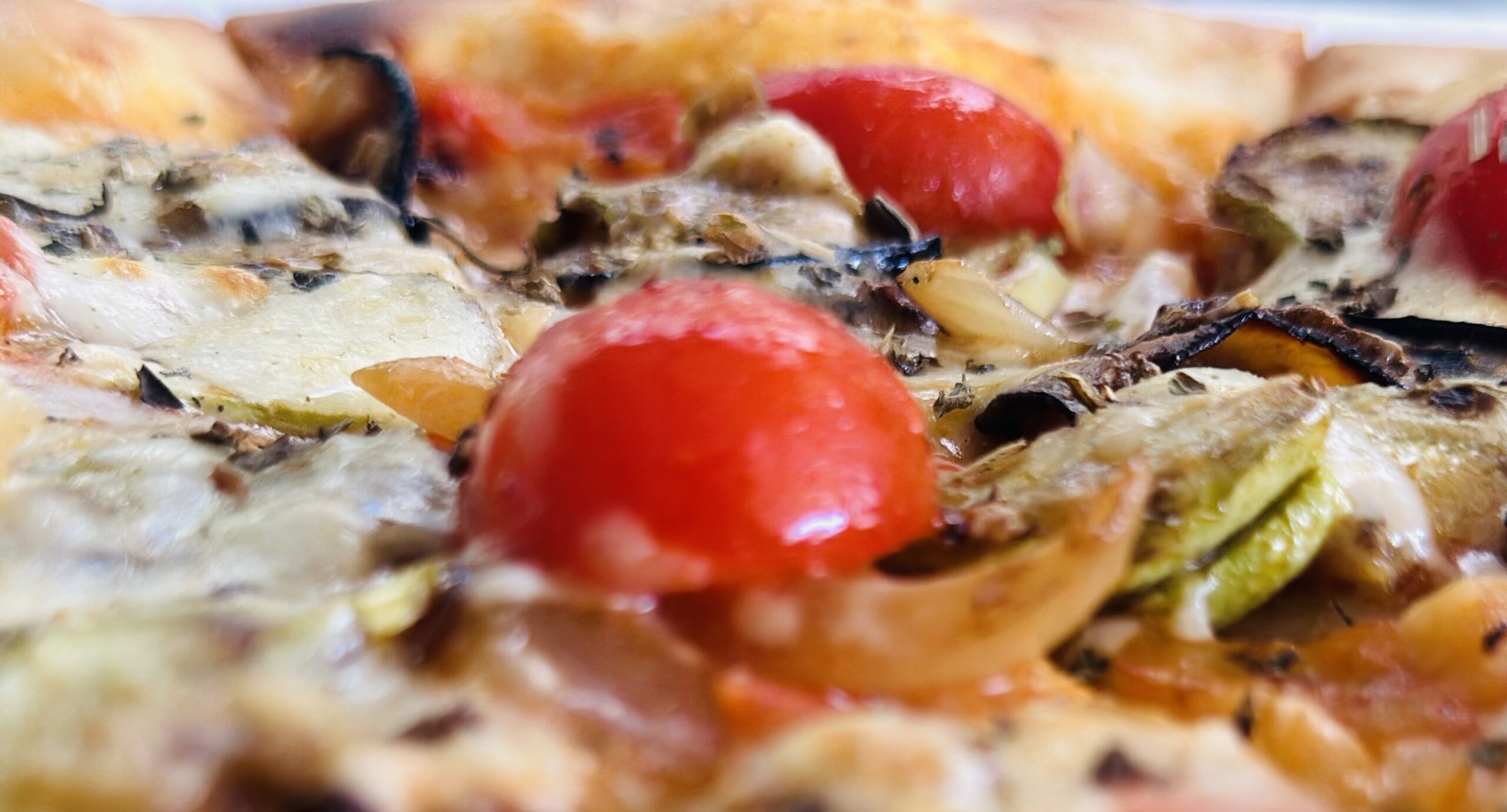 Poivrons grillés, champignons, olives noires, tomates cerises et mozzarella